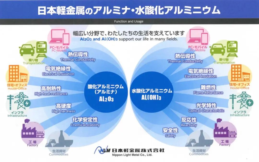 日本輕金屬(Nippon Light Metal)化學品氧化鋁及氫氧化鋁,具有卓著的物理性能,優異的化學性能,作為陶瓷耐火和磨料的原料,其產品典型特征種類清晰,應用方向明確細分: